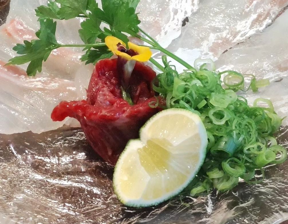 アテは、ナガスクジラの刺身。それをスダチ塩でいただきます。マスターが「今日はぜひこれを食べてほしい」と、鯛のお造りと合わせて持って来てくれた、アイスランド産の高級品です。ナガスクジラは、クジラの中でも最も味が良いらしいです。ほんの3切れだけなんですが、これは今日飲む予定の他のお酒よりも、二兎さんに合わせたい。