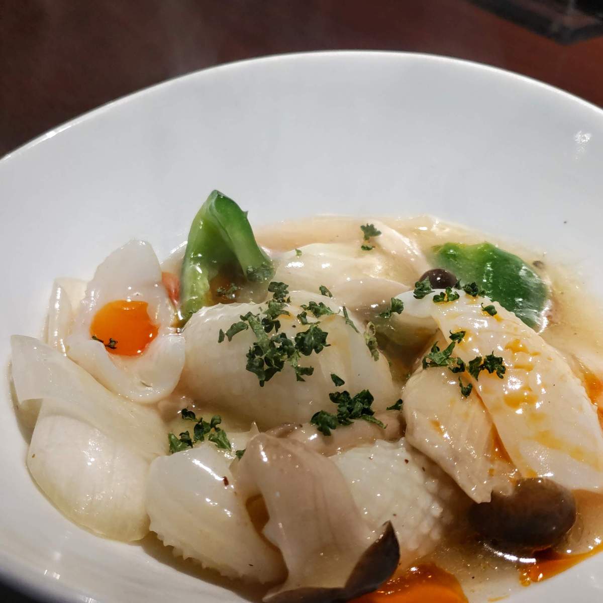 アテは、紋甲イカの塩炒め。このお店では元々定番メニューだったんですが、紋甲イカの値上がりで最近はメニューから外してたんだそうです。でも、常連さんがみんな残念がるから、久しぶりに仕入れたんだとか。うん。残念がるのめっちゃわかる。イカがぷりっぷりで、餡も旨味たっぷりで、めちゃくちゃ美味しい。そしてお酒に合わせると、さっきまで控えめだった生酛のワイルドな旨味がぽわあああ。