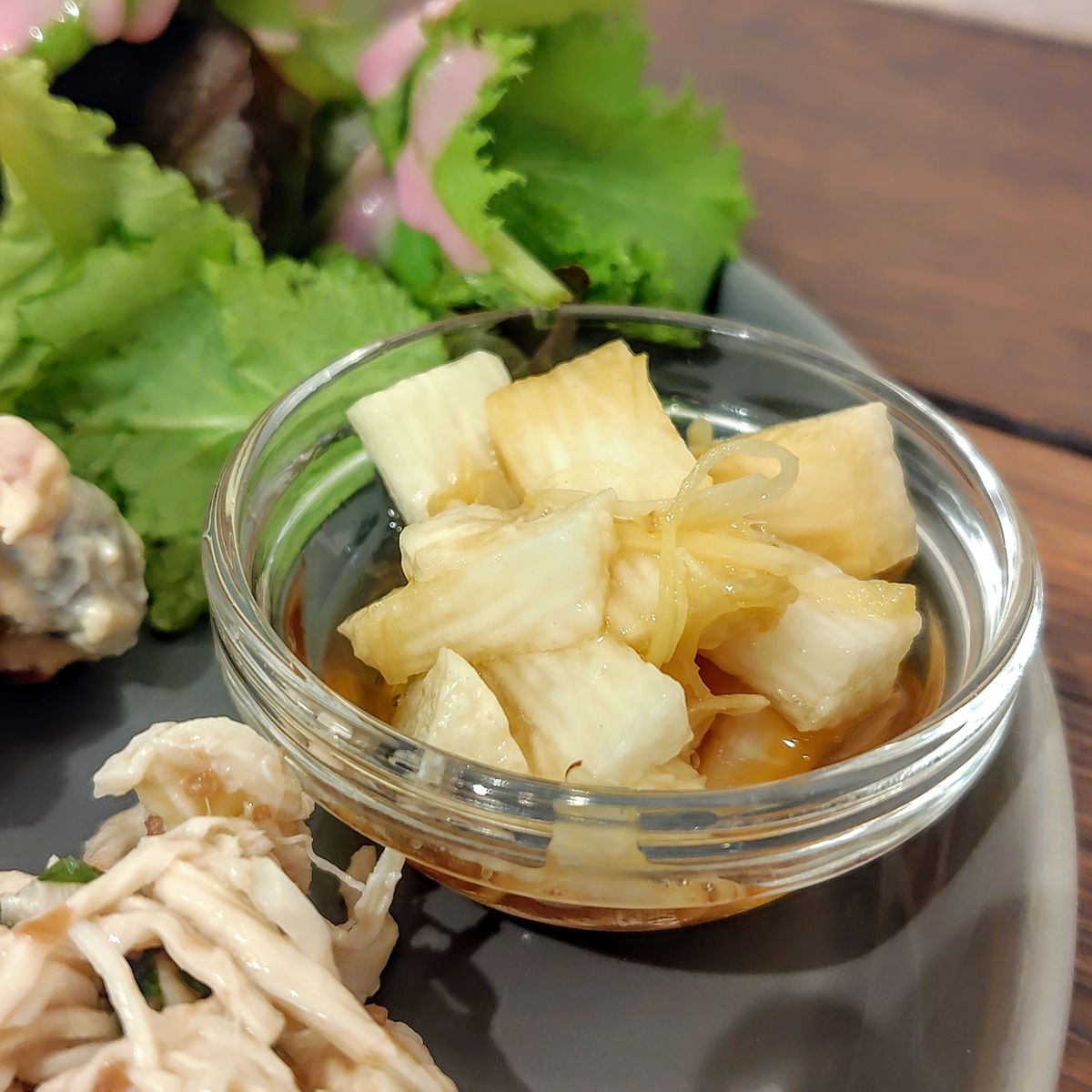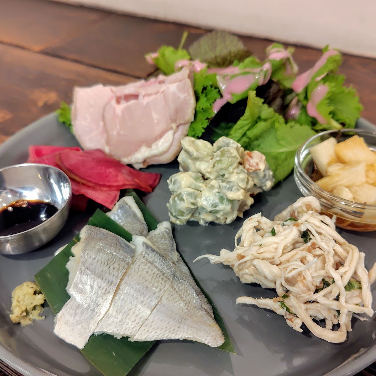 アテは、幅広く合います。こちらのお店はアテの盛り合わせが良くて、今回はその中で、鶏の梅紫蘇和え・ピンクの紫たまねぎソースがかわいいローストポーク・〆コハダに合いました。さらに面白かったのが、長芋ポン酢。エノキの旨味と上品な砂糖の甘味、そしてちょっとショウガが効いています。それにお酒を合わせると、甘味は減るけど、複雑さがぐいっと深まってうまうま。